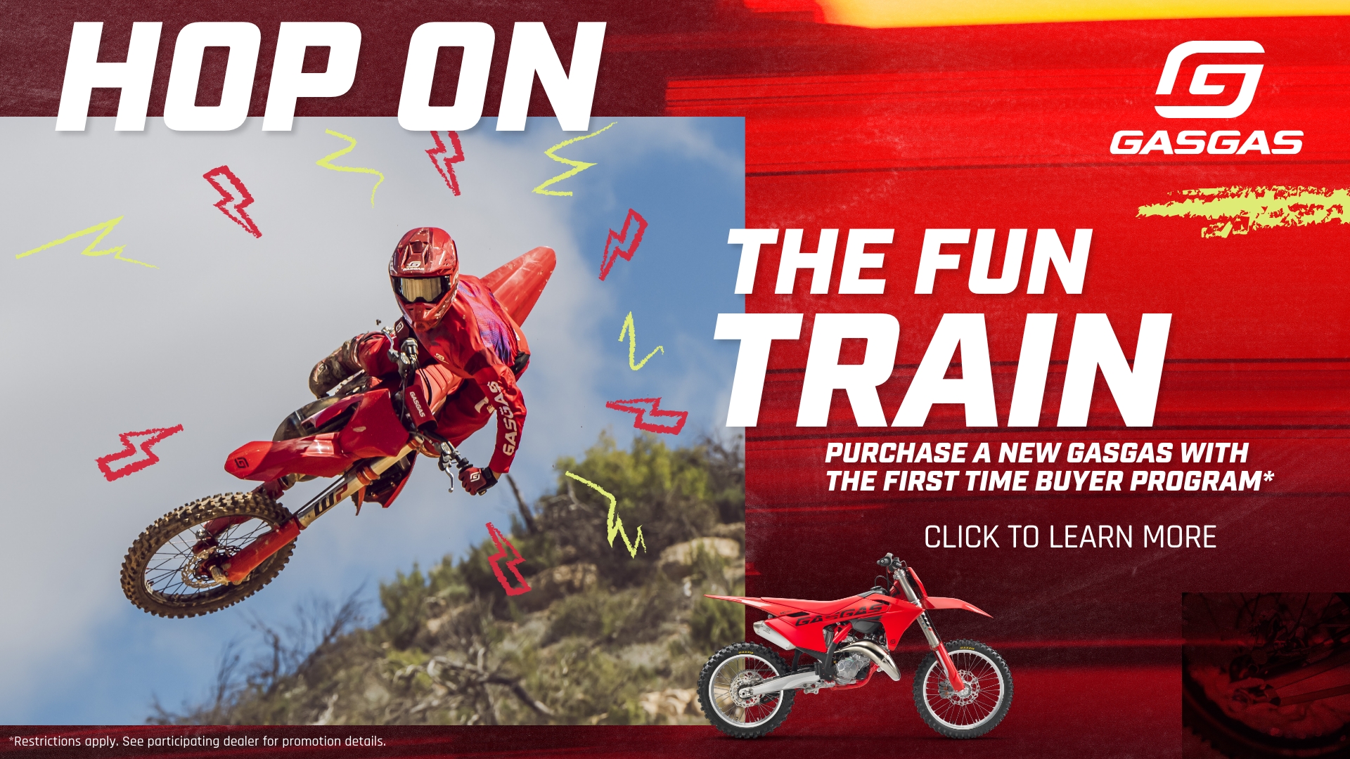 *Terms and Conditions: : Offer applies to new, untitled and unregistered 2024 GASGAS TXT RACING (250 / 300), TRAILS GP (250 / 300), MC-E (3 / 5), MC (50 / 65 / 85 (17/14 & 19/16) / 125 / 250 / 250F / 350F / 450F / 450F Factory Edition), EX (250 / 300 / 250F / 350F / 450F), EC (250), ES (350 / 500 / 700) and SM 700 model motorcycles. Financing offer available through Santander Consumer Bank “Santander”. Where no money down is indicated, it is available only to those well-qualified applicants with approved credit. Annual Percentage Rates (APR) of 0.99% for up to 60 months, and no down payment offers available to qualified applicants only. Santander requires a minimum financing amount of $1,500. Not all buyers will qualify and if approved may receive a higher rate and higher payment, depending on credit score. Some buyers will require a higher down payment in order to receive credit approval. Other charges may apply. Subject to model availability and dealer participation. Subject to credit approval by Santander, not all applicants will qualify. Santander maintains the right to charge back all costs of financing should a retail promotion and a financing offer be selected when the 2 cannot be combined (as defined in the retail program). Financing offer can change or be cancelled at any time. Offer valid January 1, 2026, through March 31, 2026. This offer cannot be combined with any other offers. Finance offer valid through authorized GASGAS dealers only. See local authorized dealer for details.